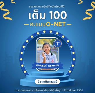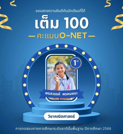ขอแสดงความยินดีกับเด็กหญิงพรสวรรค์ พรหมชนะ ที่ได้คะแนนเต็ม 100 วิชาคณิตศาสตร์ ชั้นประถมศึกษาปีที่ 6 ในการทดสอบทางการศึกษาระดับชาติขั้นพื้นฐาน O-NET ปีการศึกษา 2566
