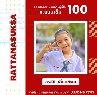 ขอแสดงความยินดีกับผู้ที่ได้คะแนนเต็ม 100 ในการประเมินคุณภาพผู้เรียนด้านการอ่าน (Reading Test) ชั้นประถมศึกษาปีที่ 1 ปีการศึกษา 2566