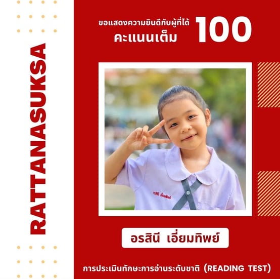 ผลงานยอดเยี่ยม! นักเรียนชั้นประถมปีที่ 1 สอบวัดระดับอ่านได้คะแนนเต็ม 100